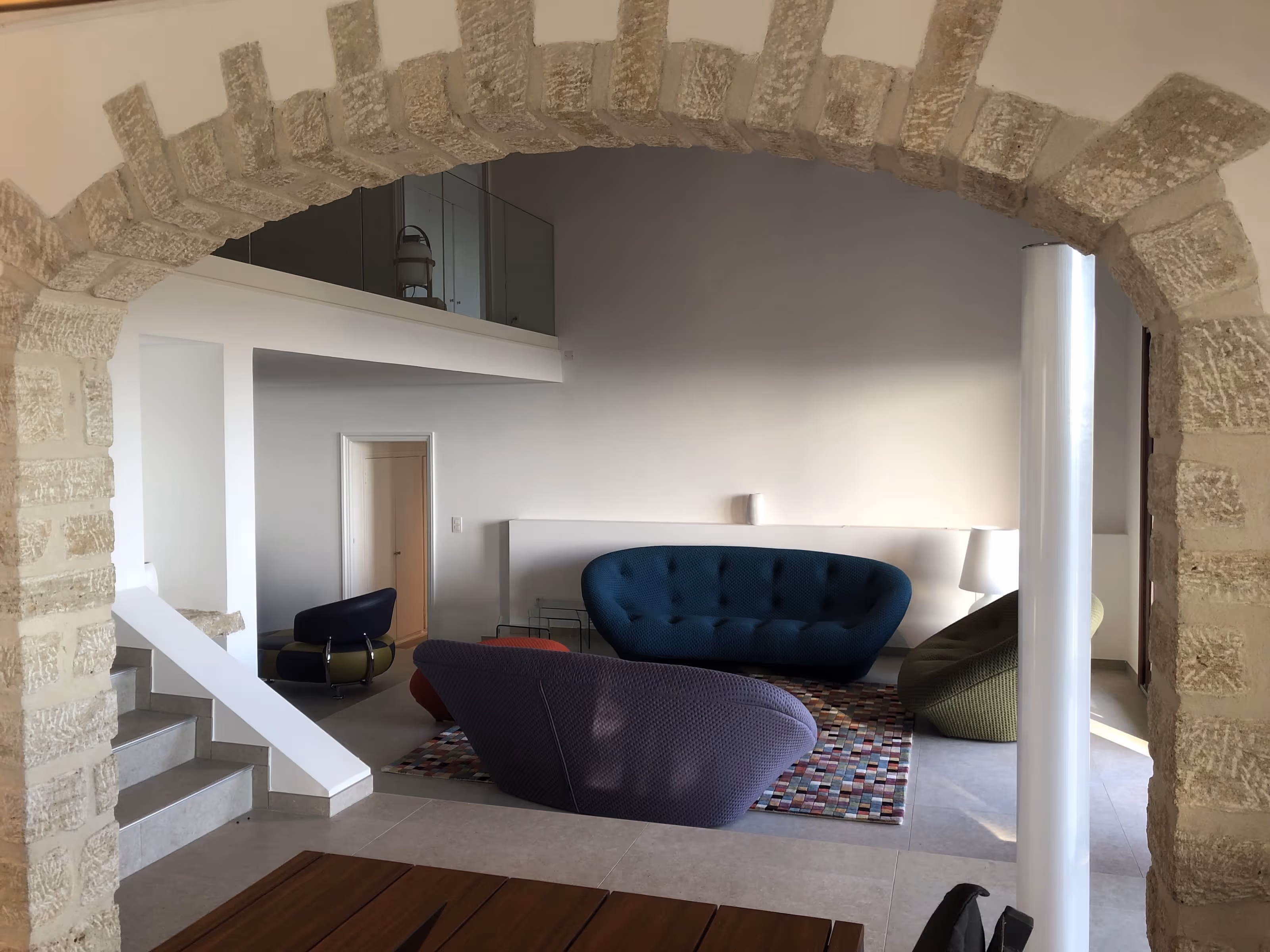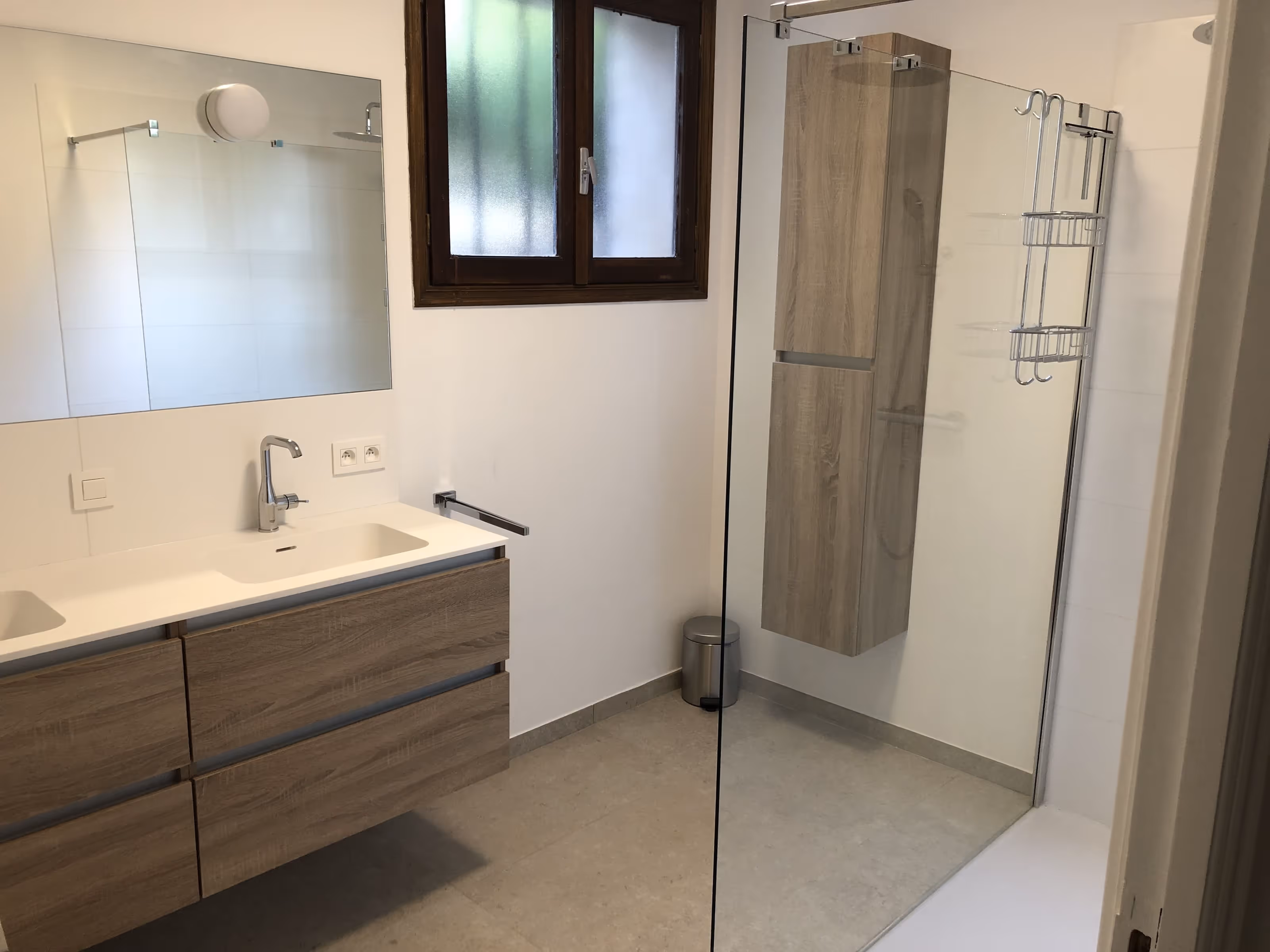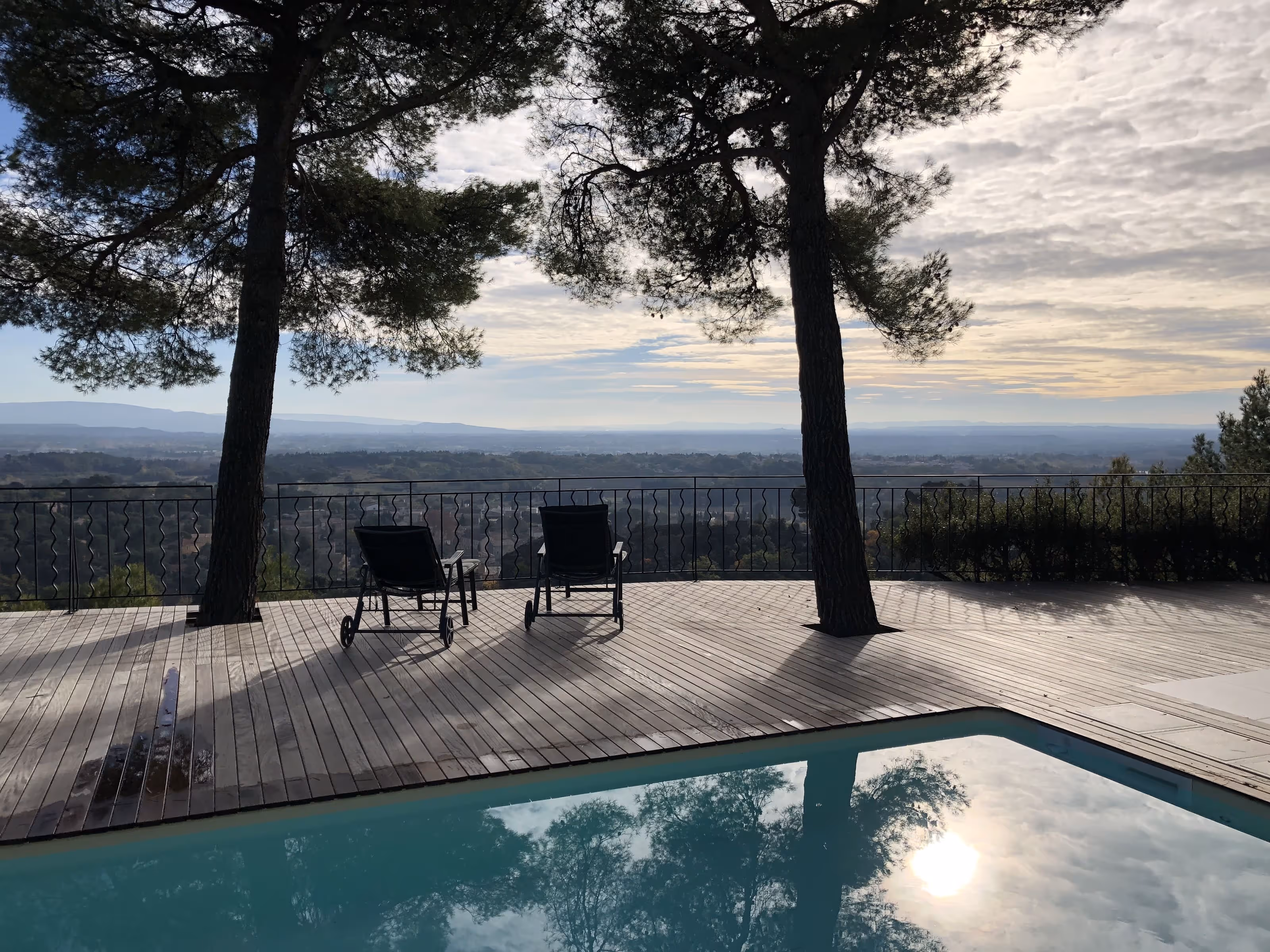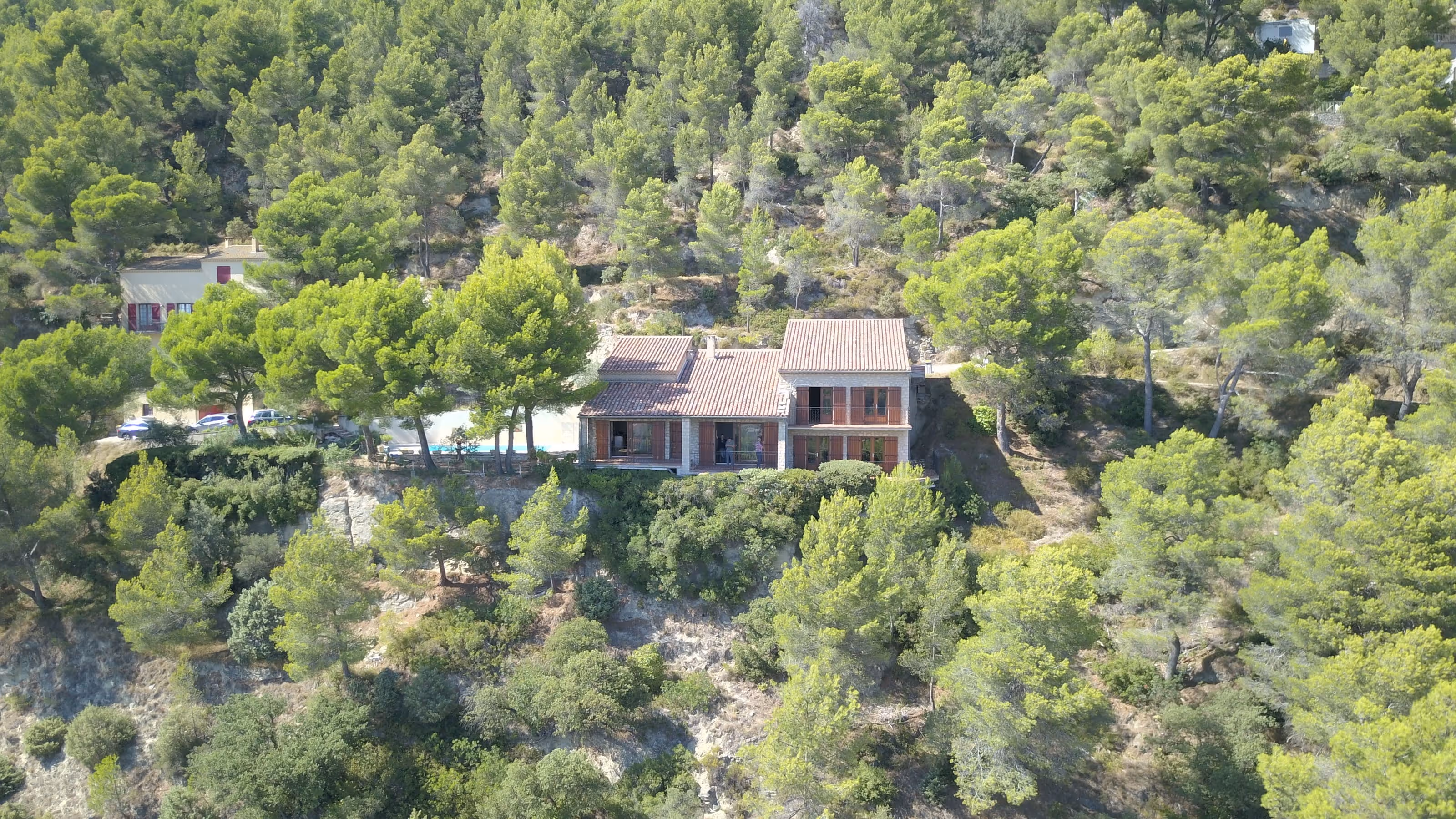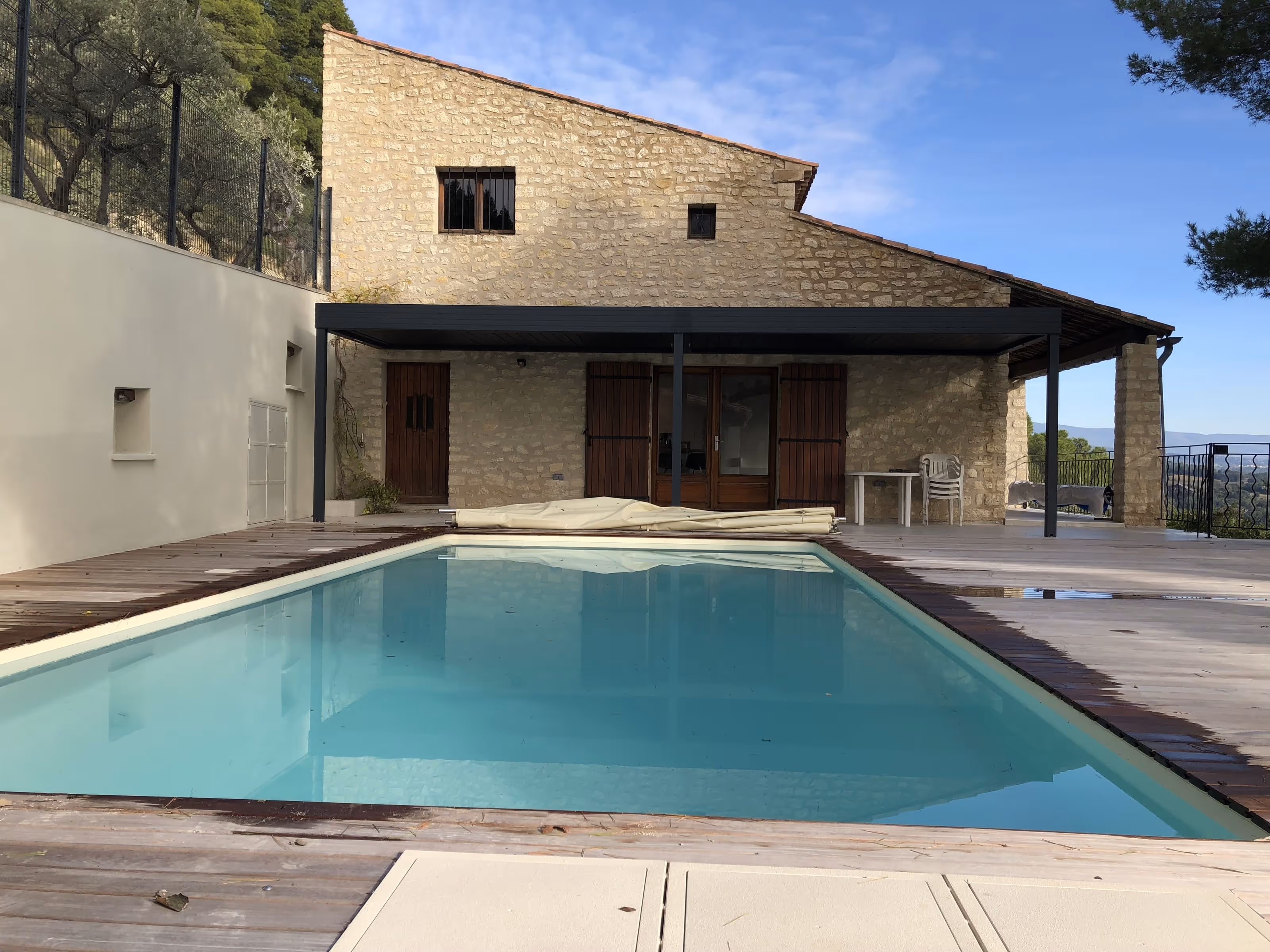 Villa en pierre posée sur le coteau. De larges terrasses en bois à garde-corps forgé prolongent la maison au plus près de la piscine et ouvrent une vue dégagée sur la vallée. À l’intérieur, ambiance contemporaine sobre avec pierre apparente, mezzanine vitrée et finitions métal discrètes. Salle d’eau épurée avec douche à l’italienne.