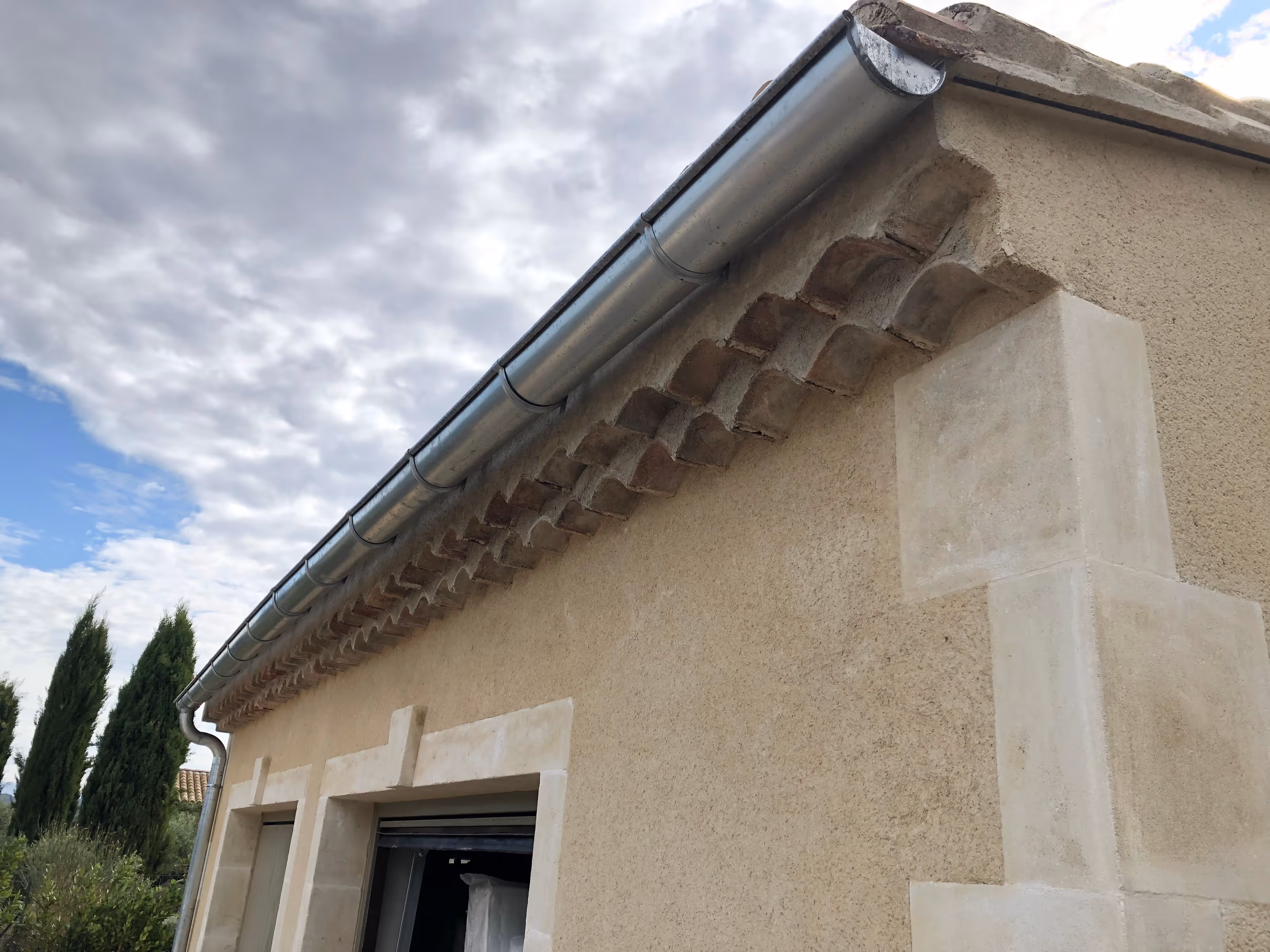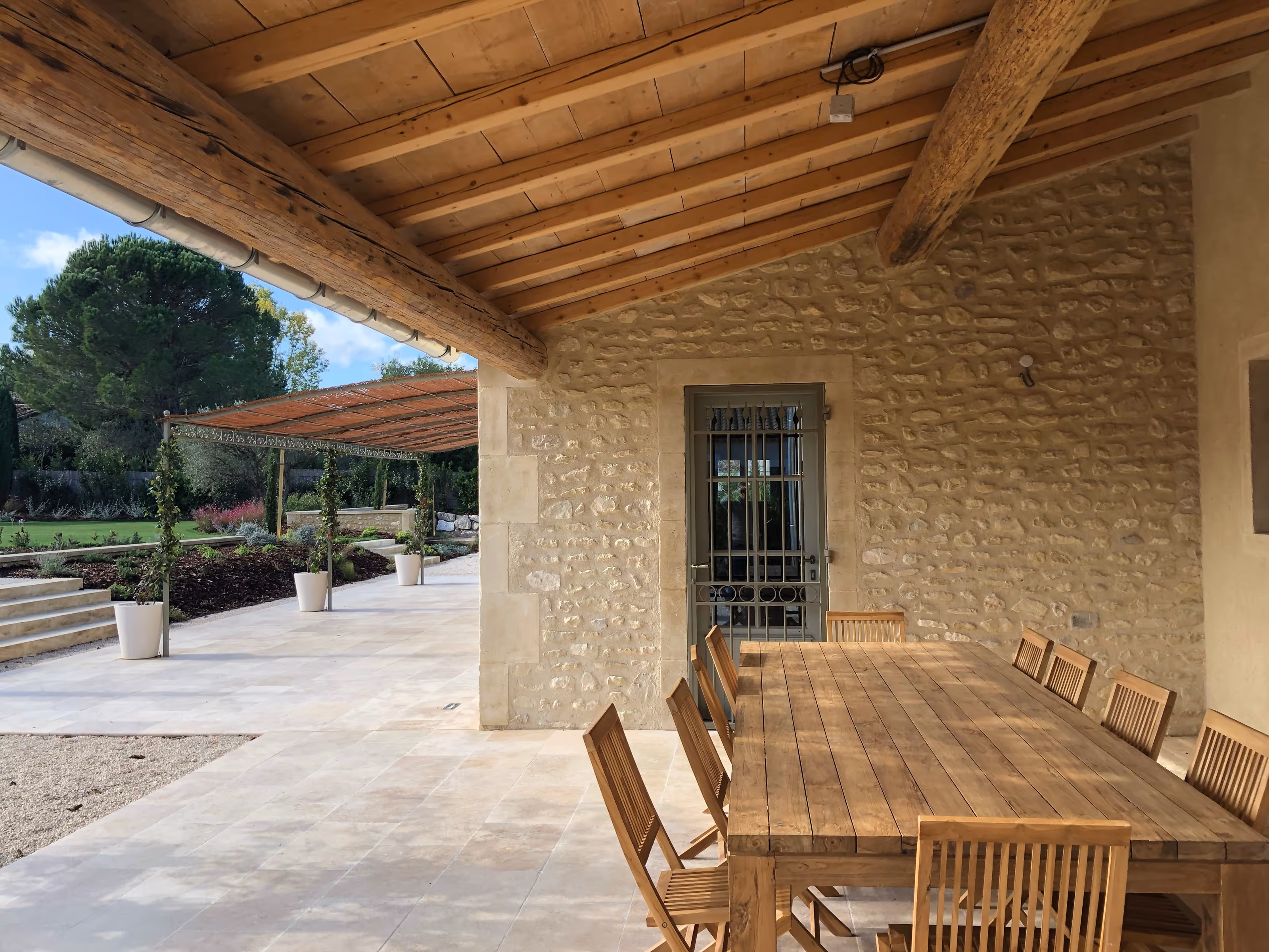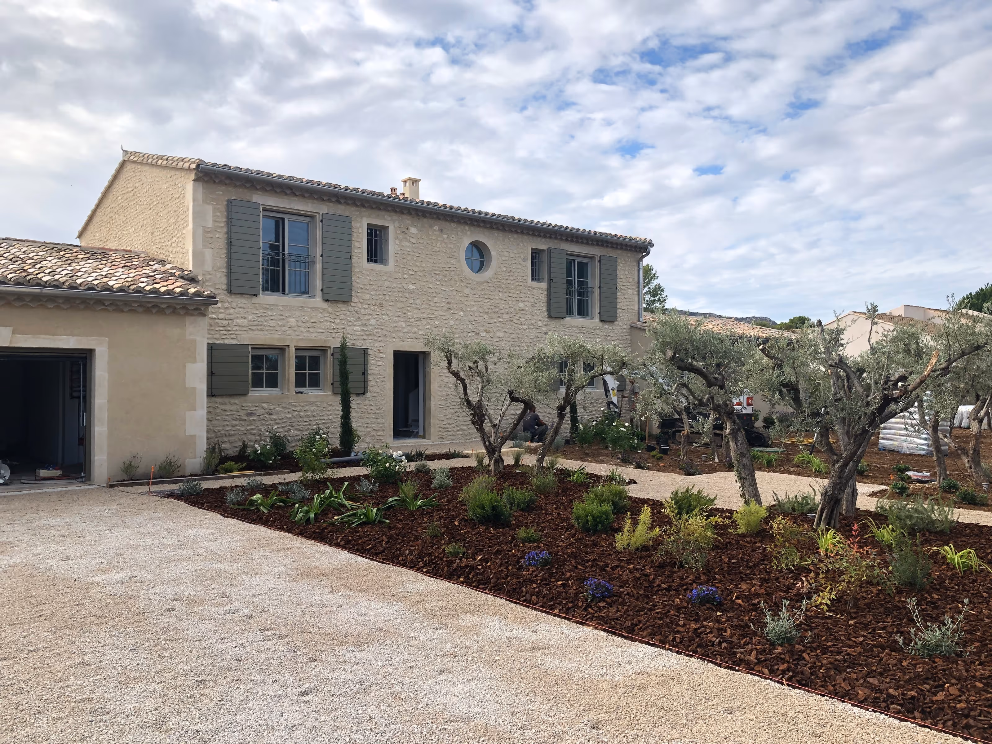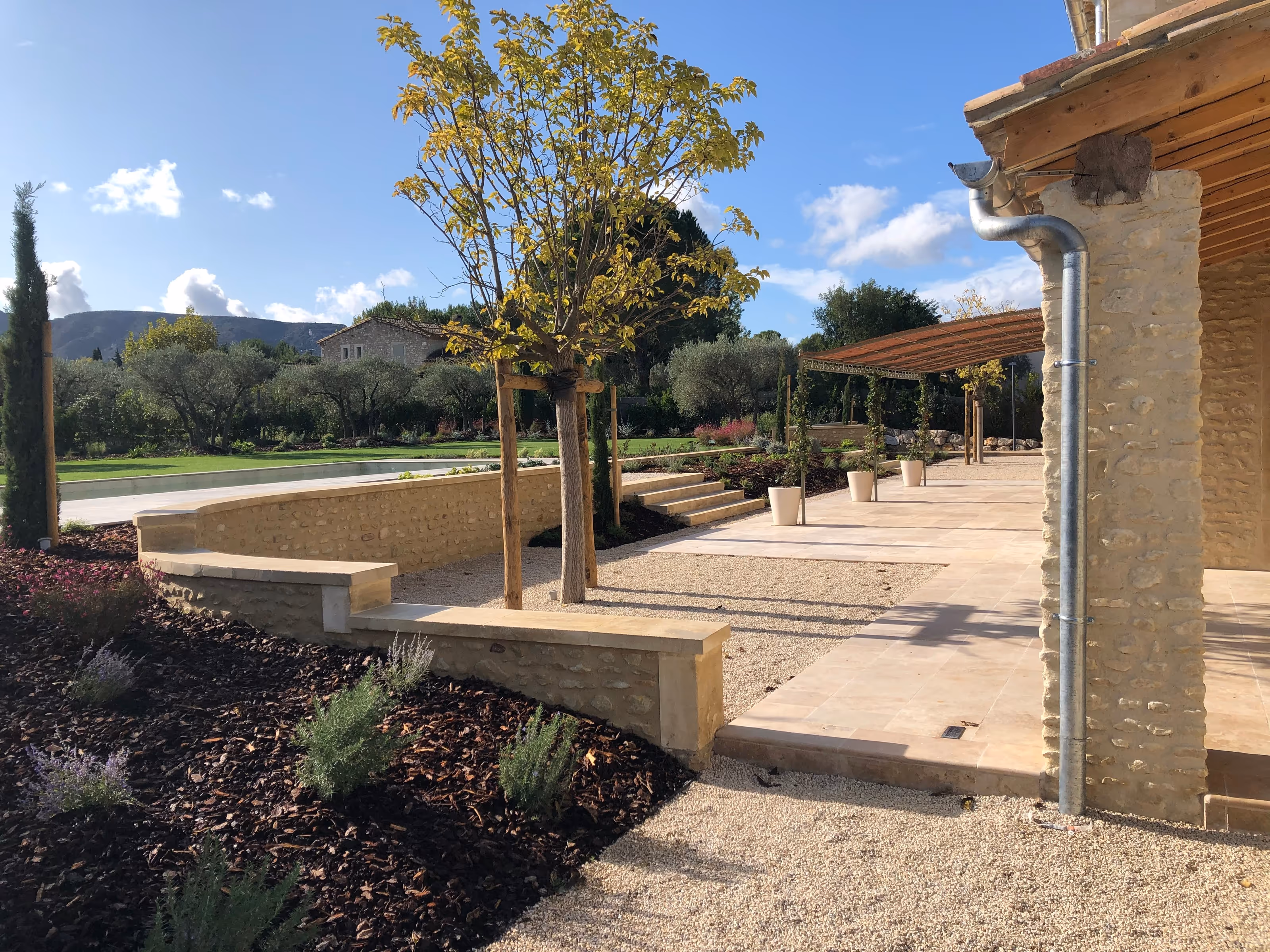 Villa en pierre sous tuiles, organisée sur deux niveaux. En façade, volets bois et fenêtre ronde rythment l’ensemble. Le jardin, planté d’oliviers et structuré par des cheminements minéraux, mène à de larges terrasses en pierre. Une pergola légère et un auvent charpenté prolongent les pièces de vie vers l’extérieur, au plus près de la piscine.