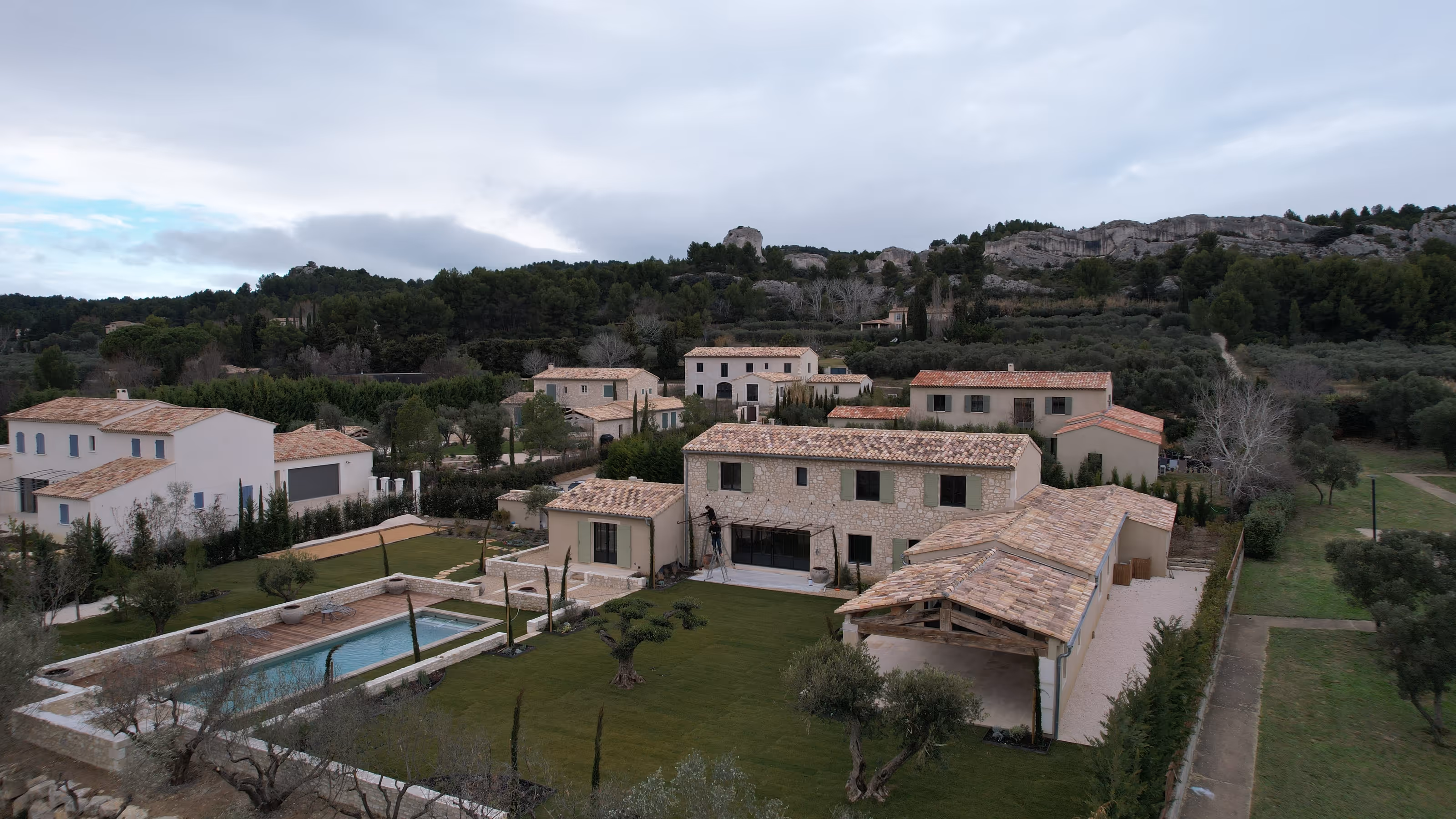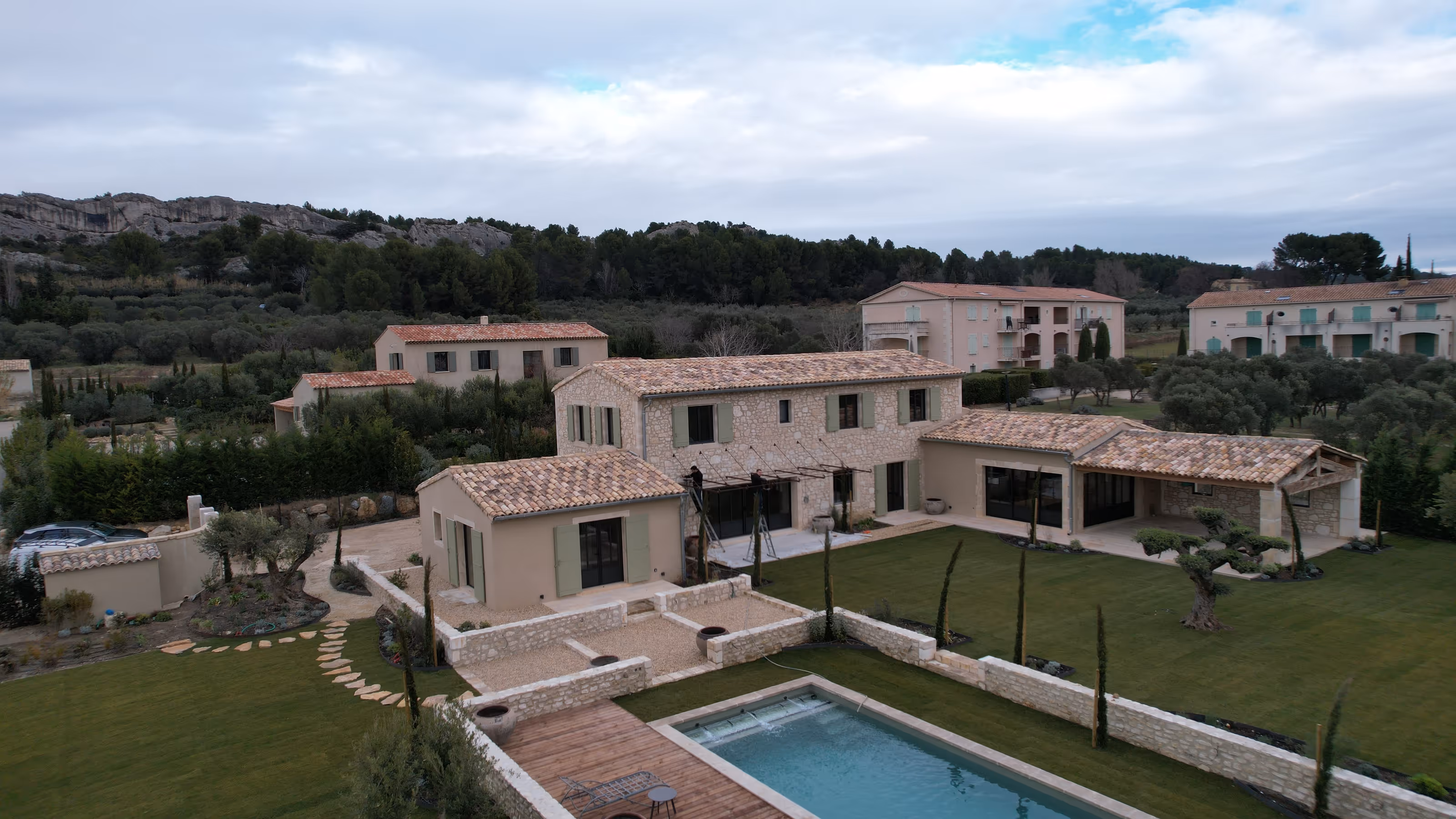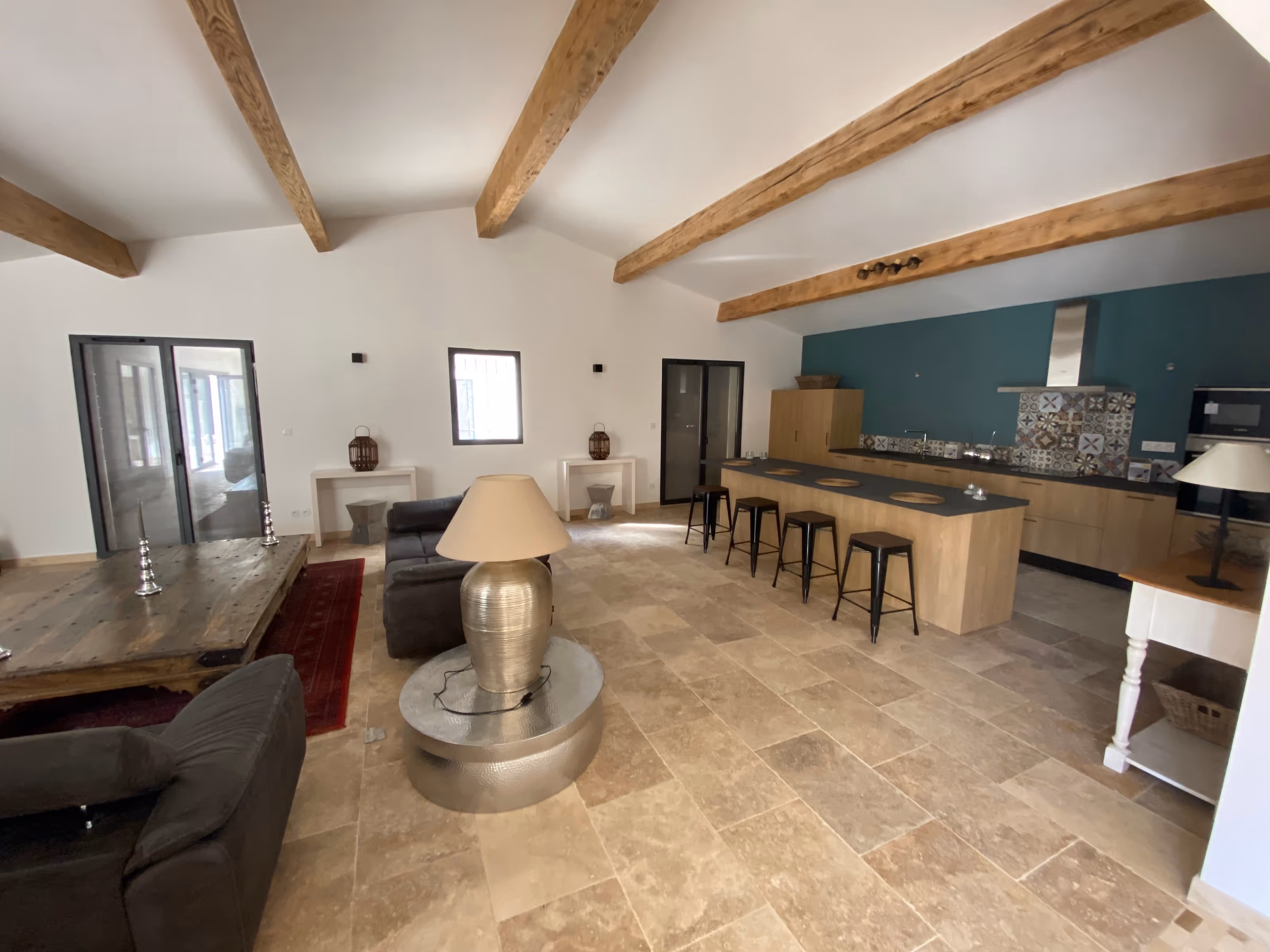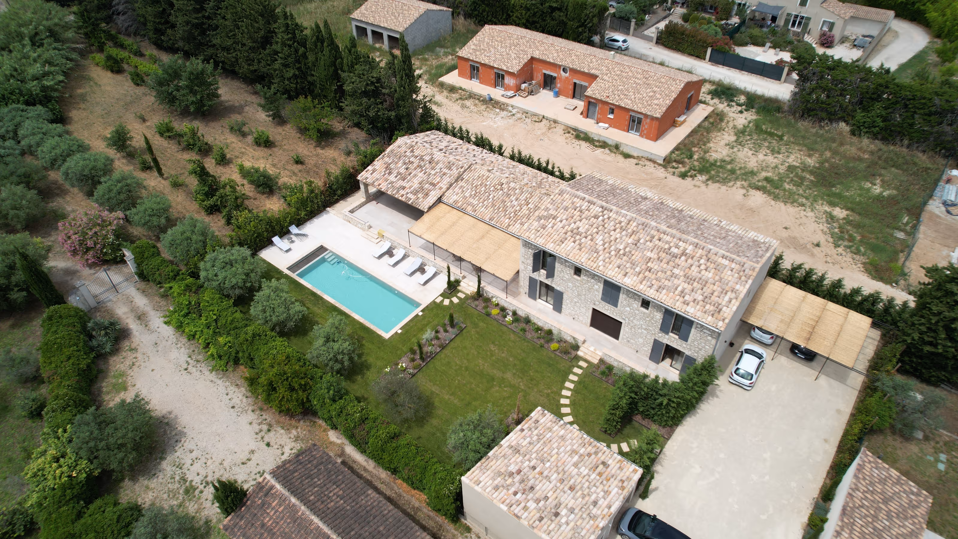 Villa organisée autour d’une grande terrasse ombragée au bord de la piscine, pensée pour prolonger la vie au jardin. Les façades mêlent pierre et enduit clair, sous tuiles canal et volets vert sauge, tandis qu’à l’intérieur la charpente apparente et le sol en pierre structurent l’espace.