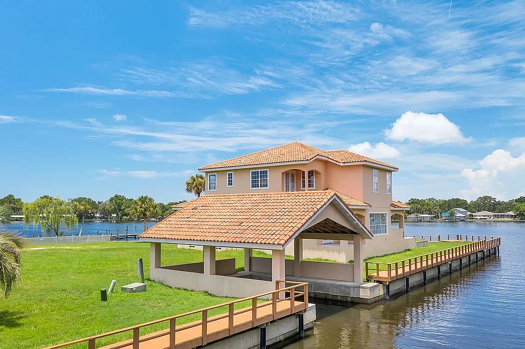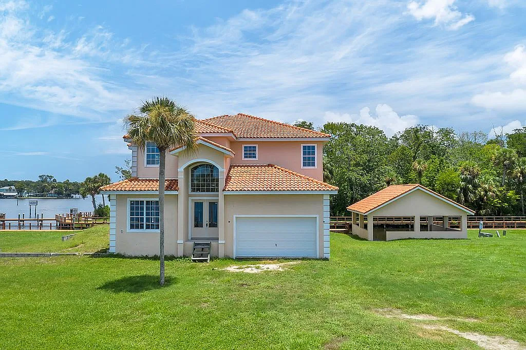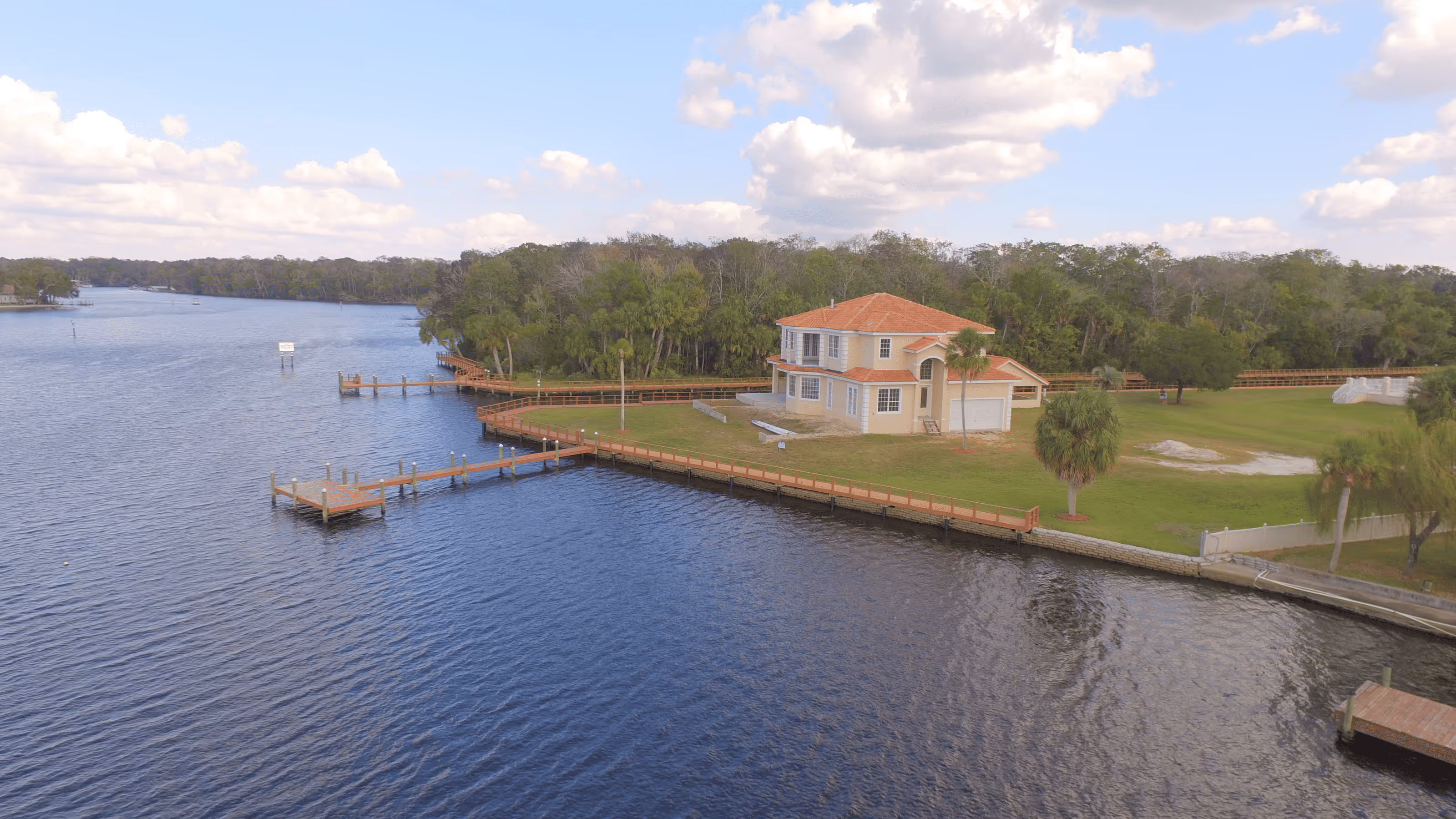 Maison riveraine implantée en pointe, offrant de larges vues sur la Homosassa River. Volume à deux niveaux, enduit clair et tuiles en terre cuite, percé de grandes baies. Un cheminement en bois ceinture la parcelle et rejoint un long ponton ainsi qu’un abri-bateau couvert. Terrasse abritée, pelouse et palmiers prolongent les pièces de vie au plus près de l’eau, pour une maison tournée vers le paysage.