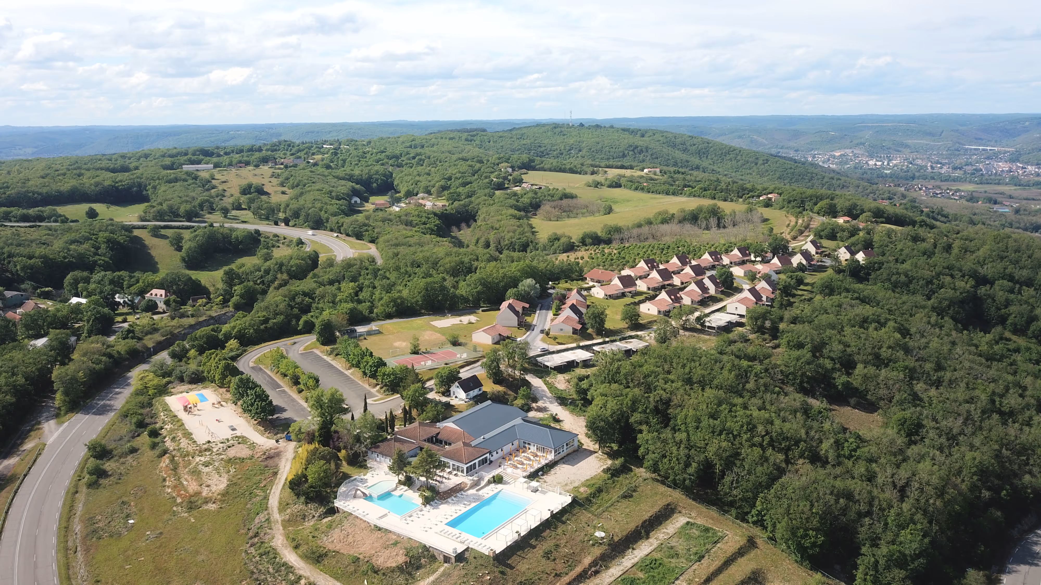 Resort implanté en belvédère, composé d’un bâtiment central avec restaurant et terrasses, en relation directe avec un ensemble de trois piscines extérieures. Les logements sont constitués de villas réparties dans le paysage, certaines intégrant leur propre bassin. L’aménagement privilégie la lisibilité du site, les circulations piétonnes et l’intégration dans le relief.
