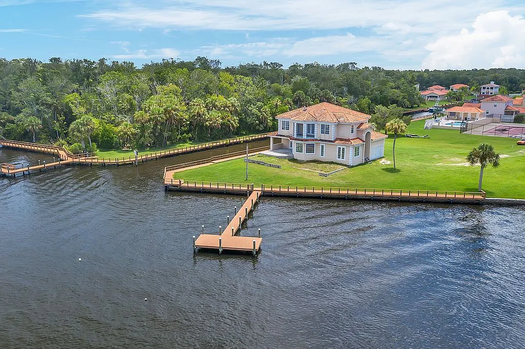 A riverfront house situated on a point, offering expansive views over the Homosassa River. Designed with two levels, light stucco walls and terracotta roof tiles, and framed by large windows. A wooden pathway surrounds the site and leads to a long dock and covered boathouse. The sheltered terrace, lawn, and palms extend the living spaces toward the water, making the home deeply connected to its landscape.