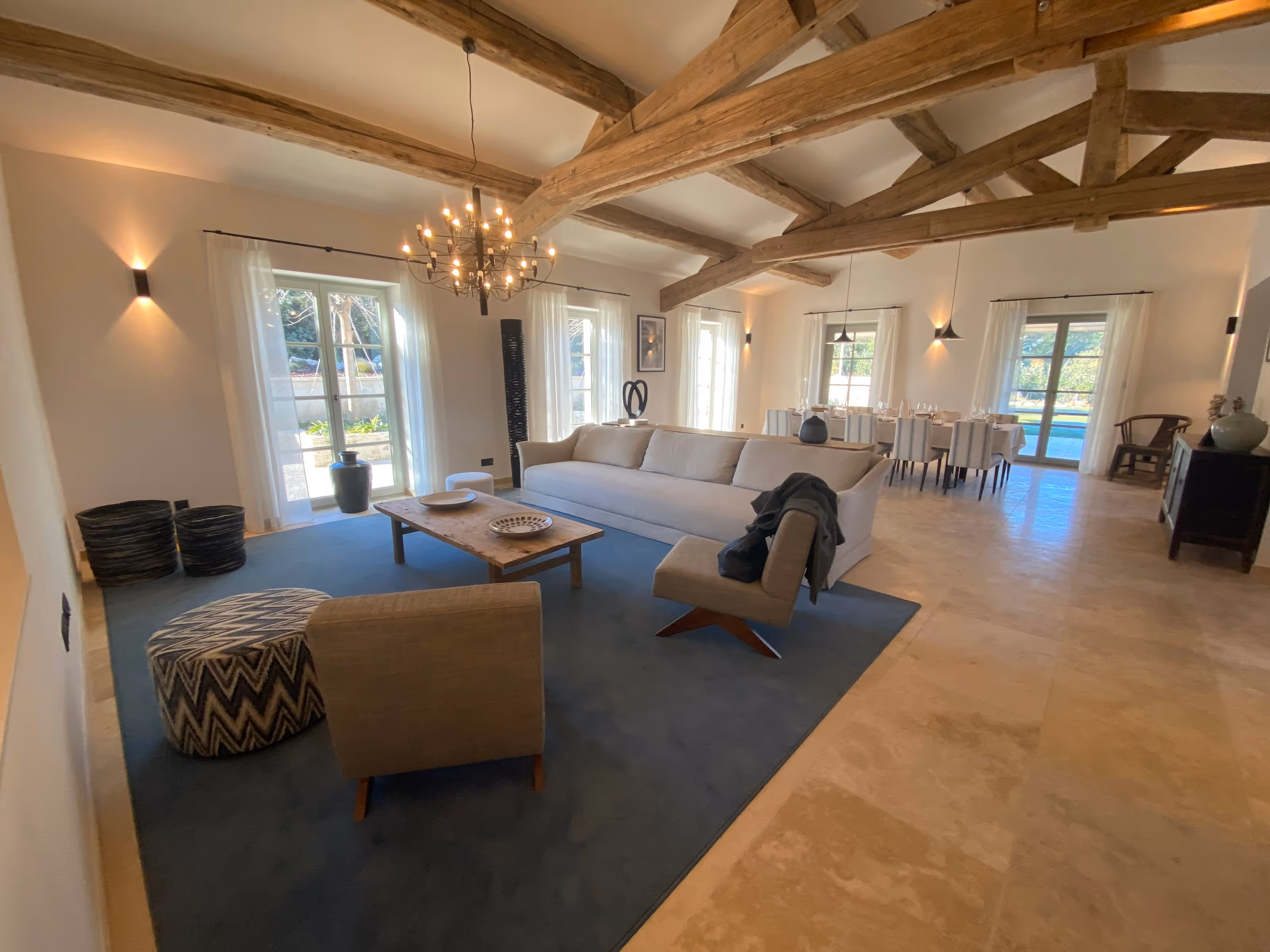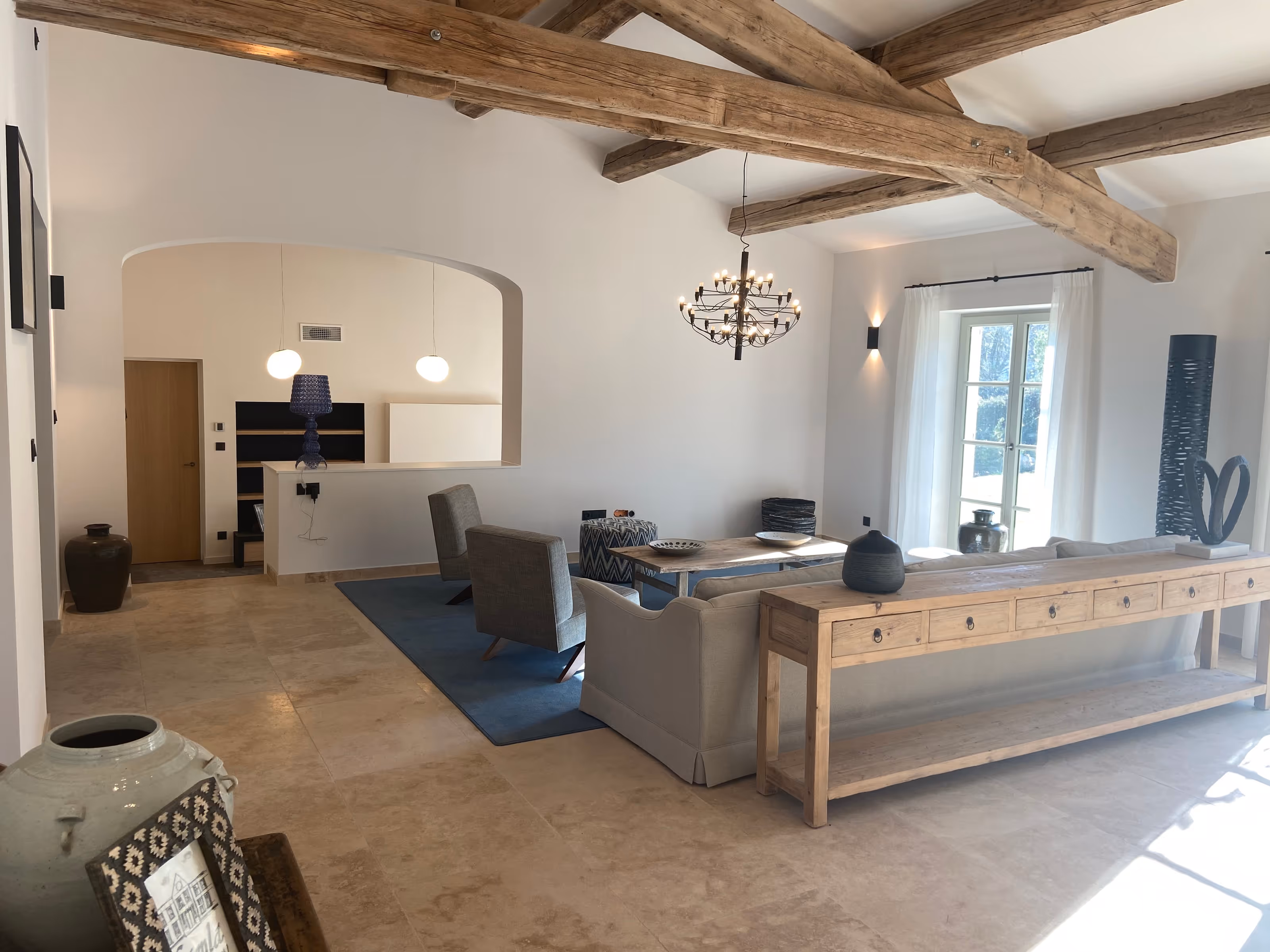 Villa en pierre sous tuiles, au cœur d’un jardin paysager. Cheminements minéraux, rochers et plantations encadrent les façades à volets. De grandes portes-fenêtres ouvrent la maison sur l’extérieur. À l’intérieur, vaste pièce de vie avec poutres apparentes et luminaires suspendus, sols en dalles de pierre ; un salon plus intime avec cheminée et mobilier intégré.