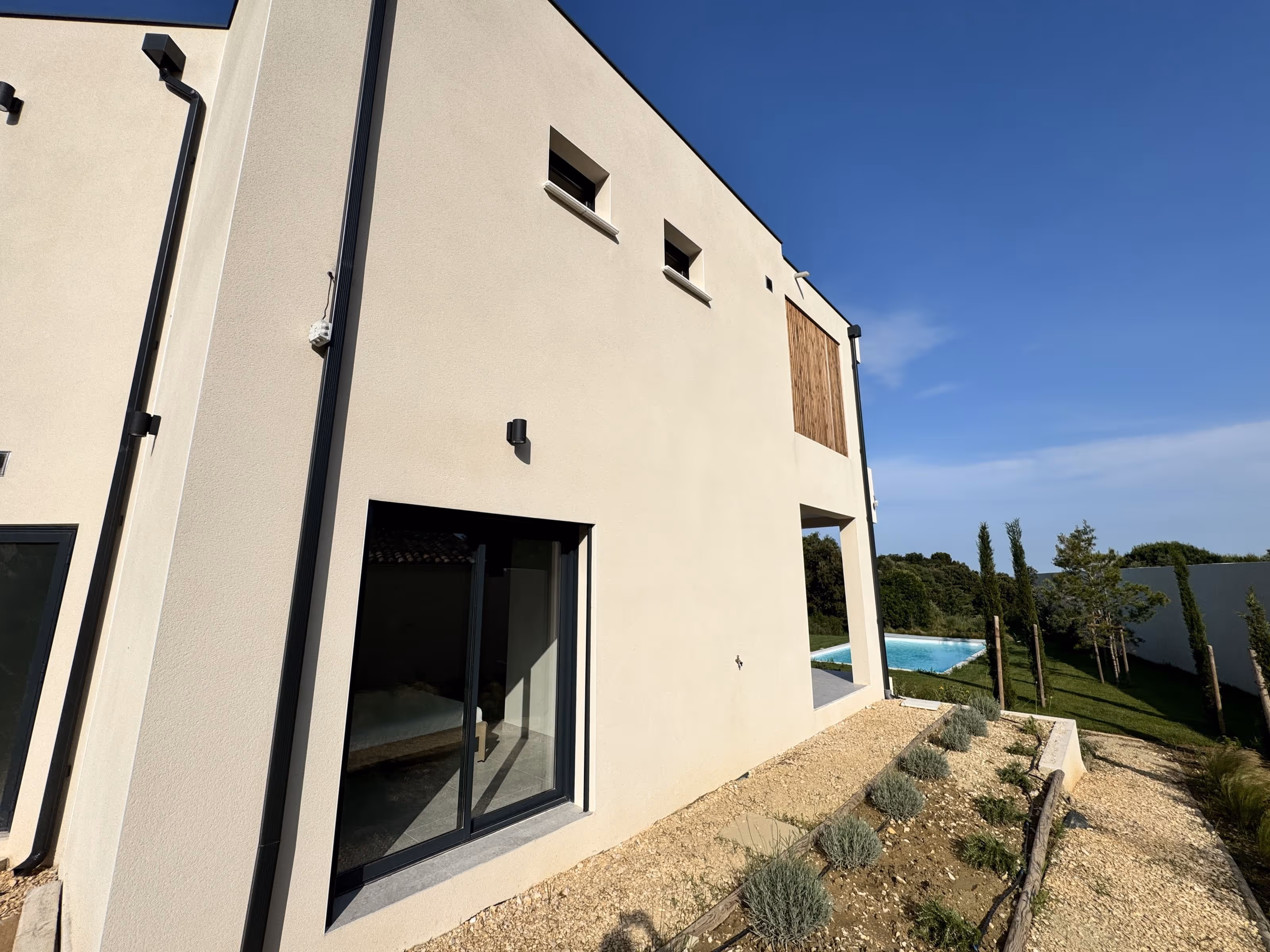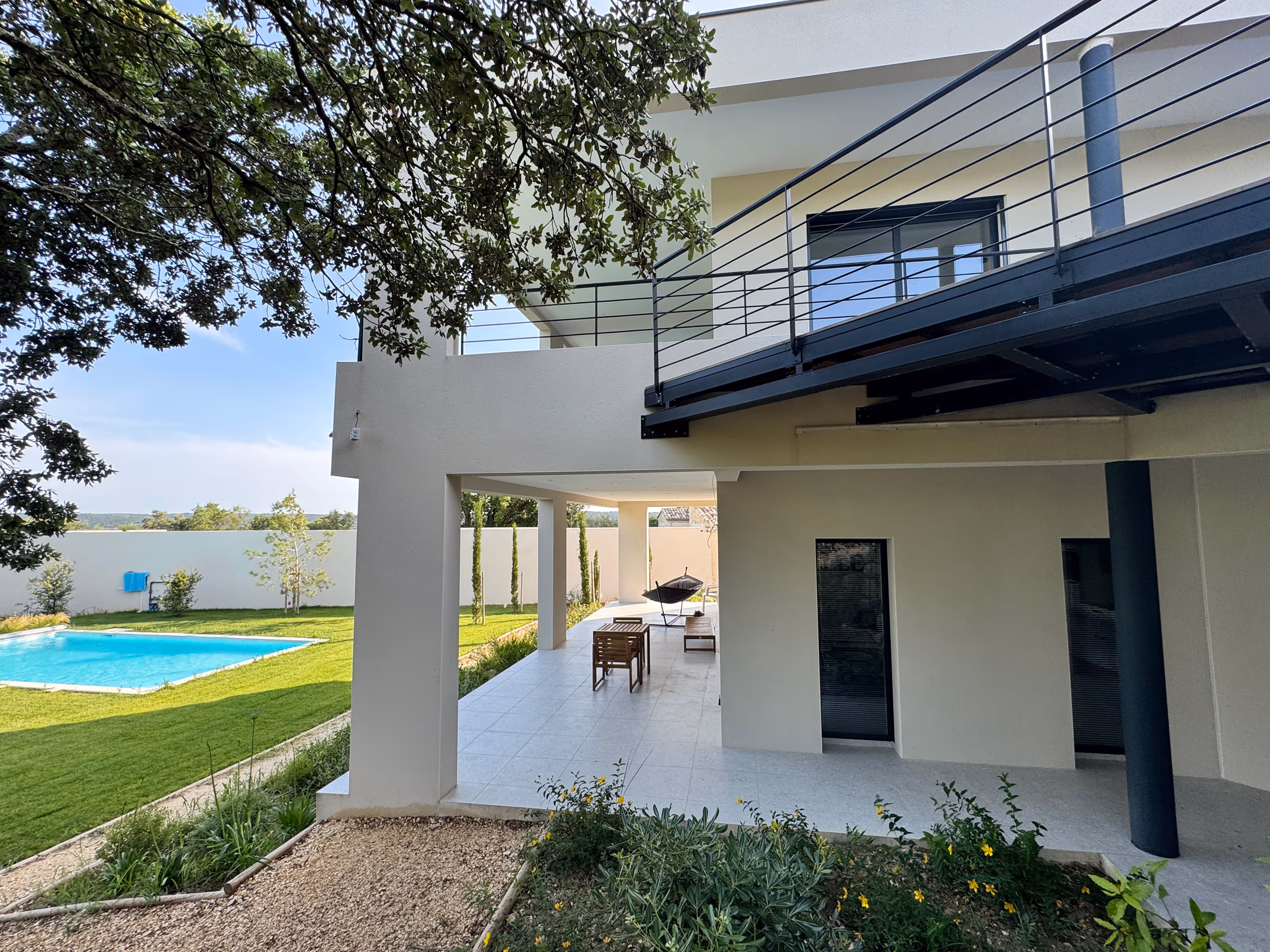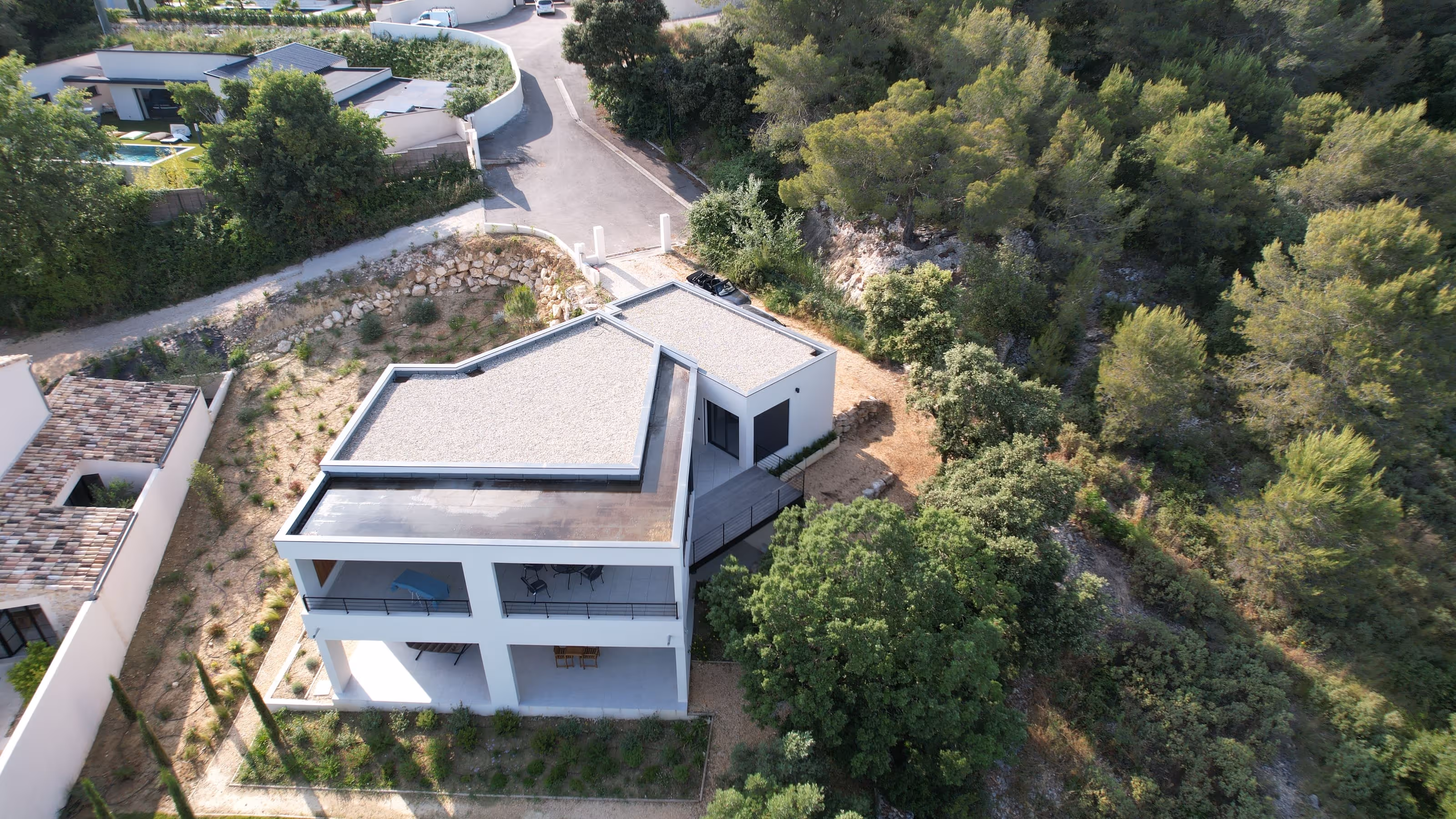 Villa aux lignes nettes sur deux niveaux. De grands portiques dessinent des espaces couverts qui prolongent la maison vers le jardin et la piscine. Façades claires, menuiseries sombres et garde-corps métalliques soulignent l’écriture, sous une toiture végétalisée.