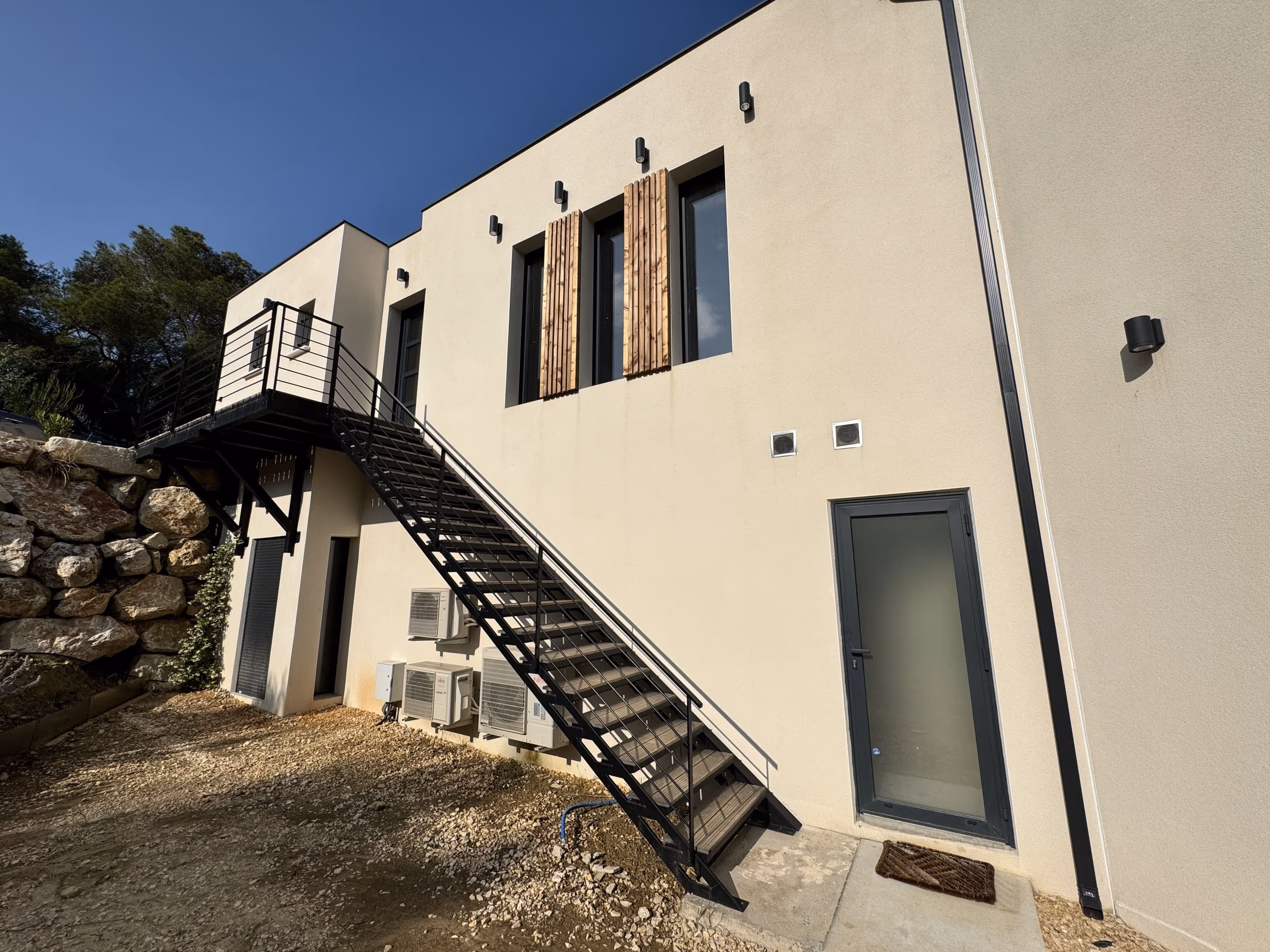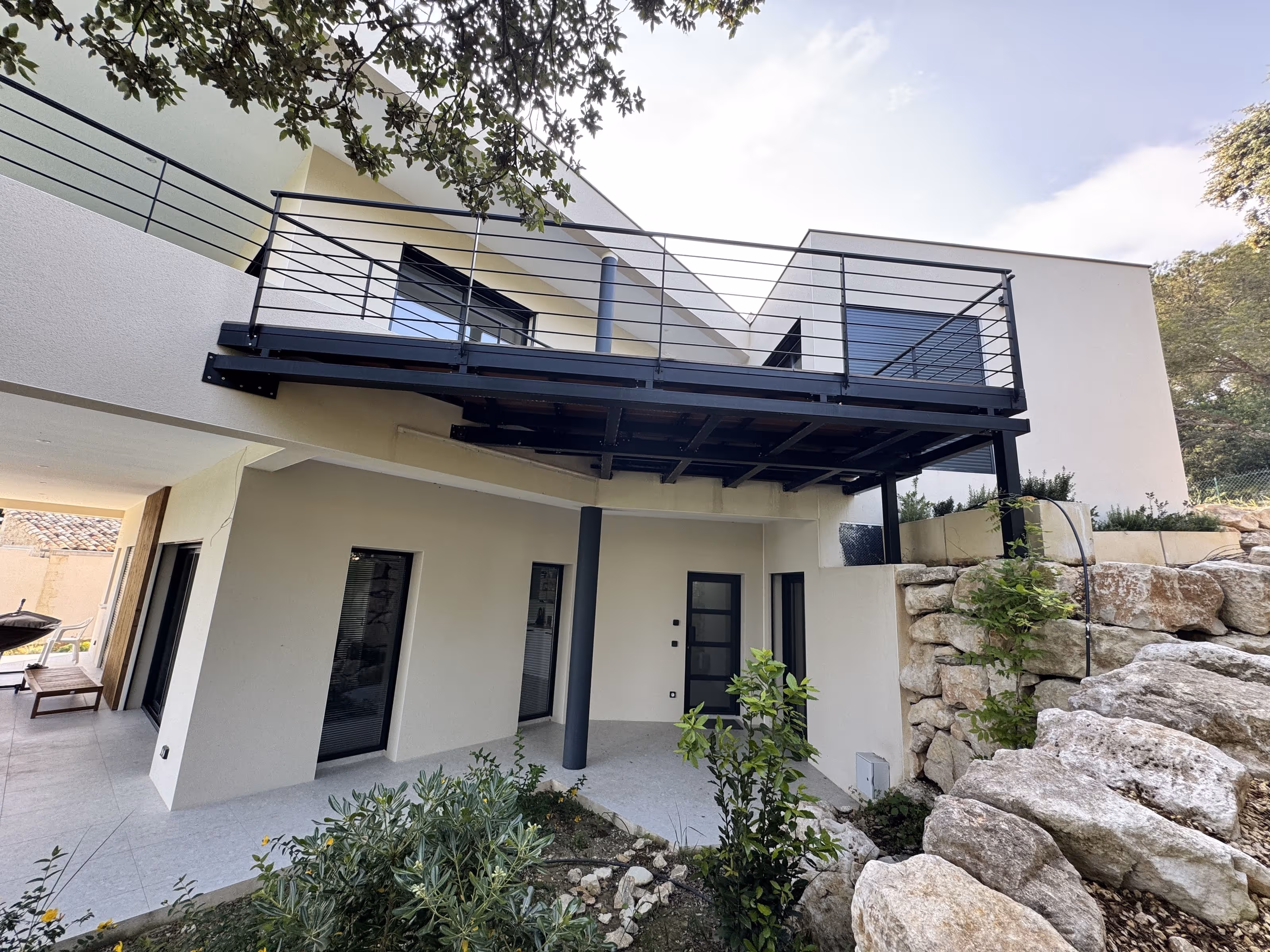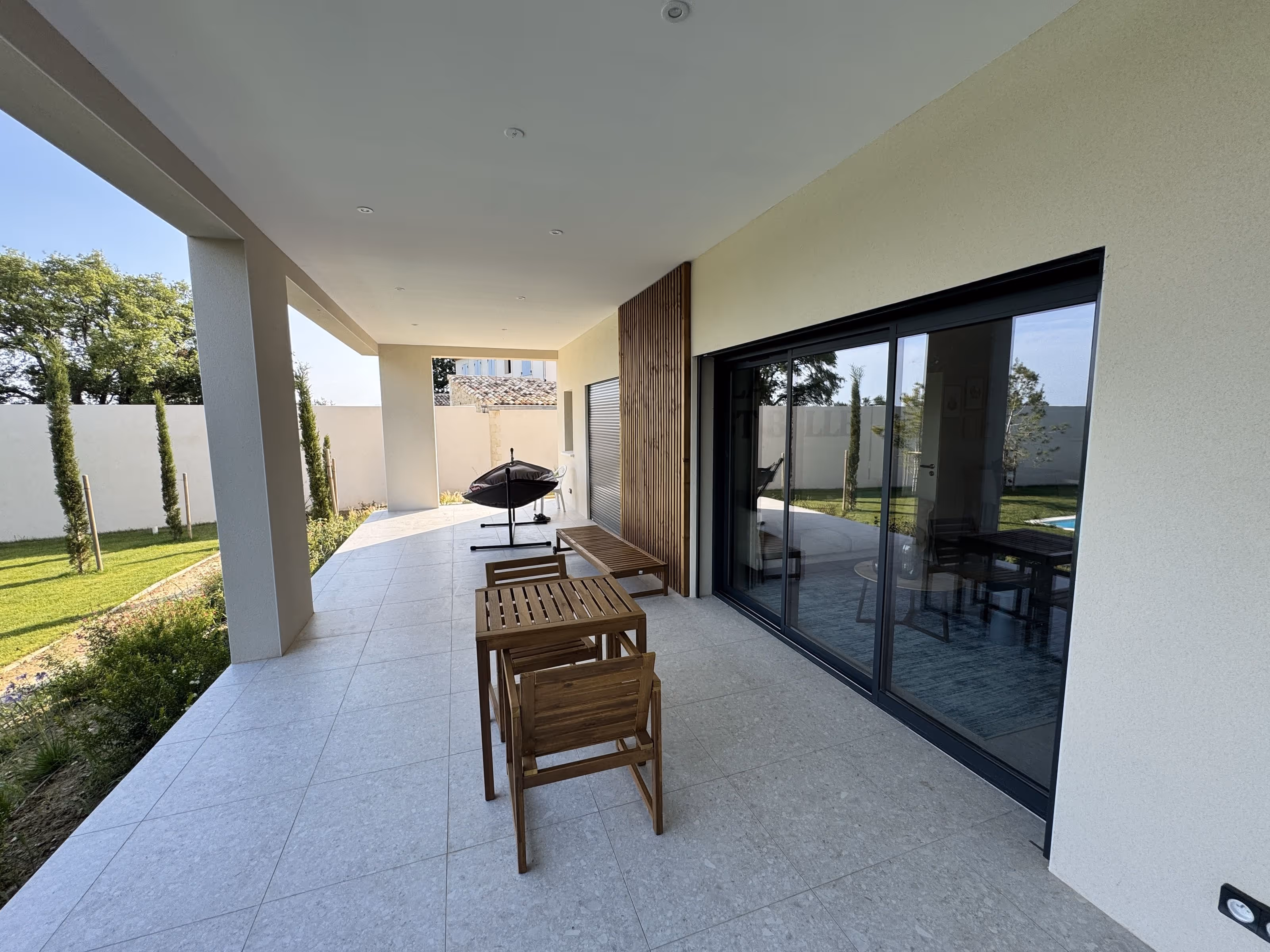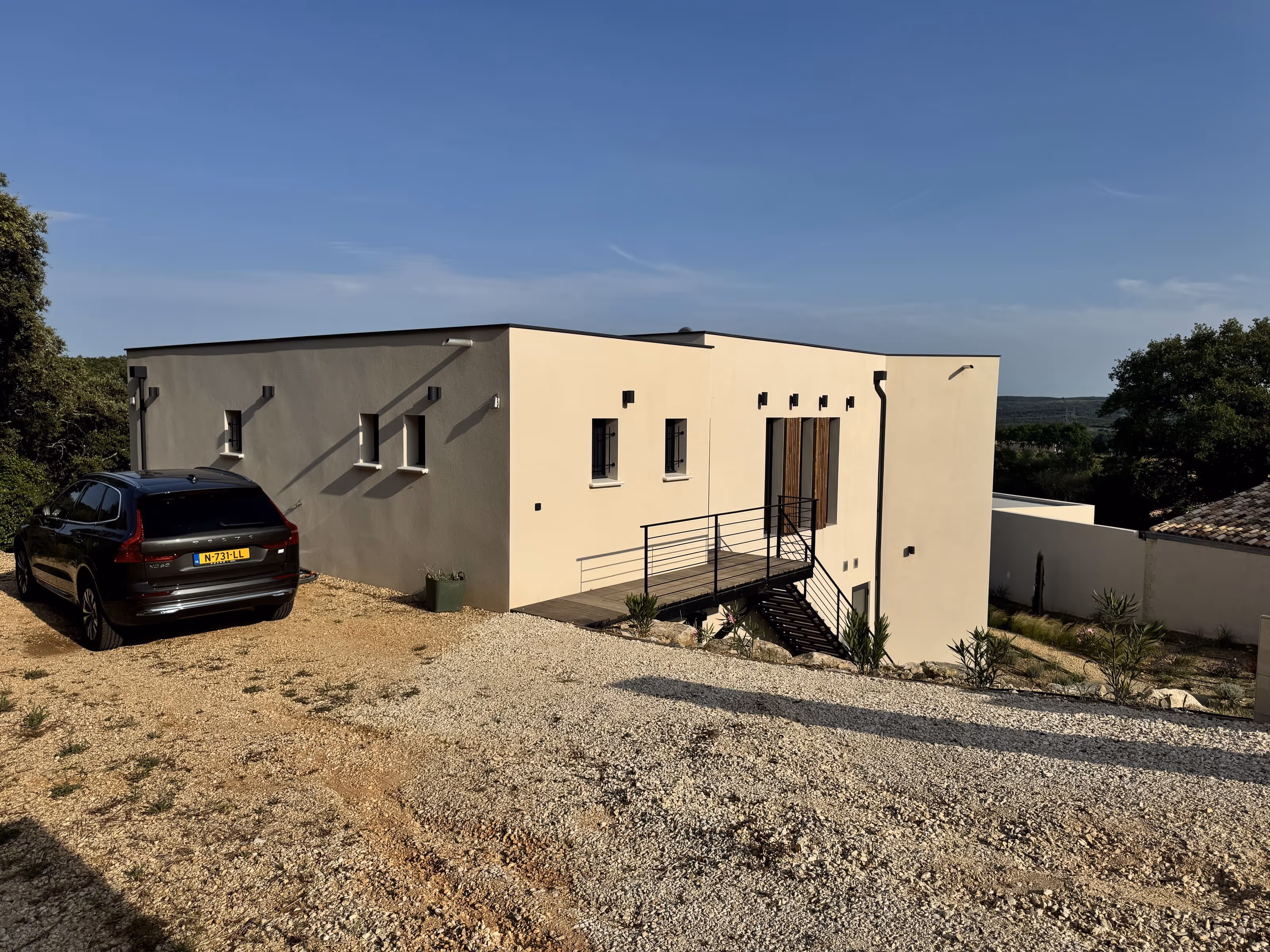 Villa aux lignes nettes sur deux niveaux. De grands portiques dessinent des espaces couverts qui prolongent la maison vers le jardin et la piscine. Façades claires, menuiseries sombres et garde-corps métalliques soulignent l’écriture, sous une toiture végétalisée.